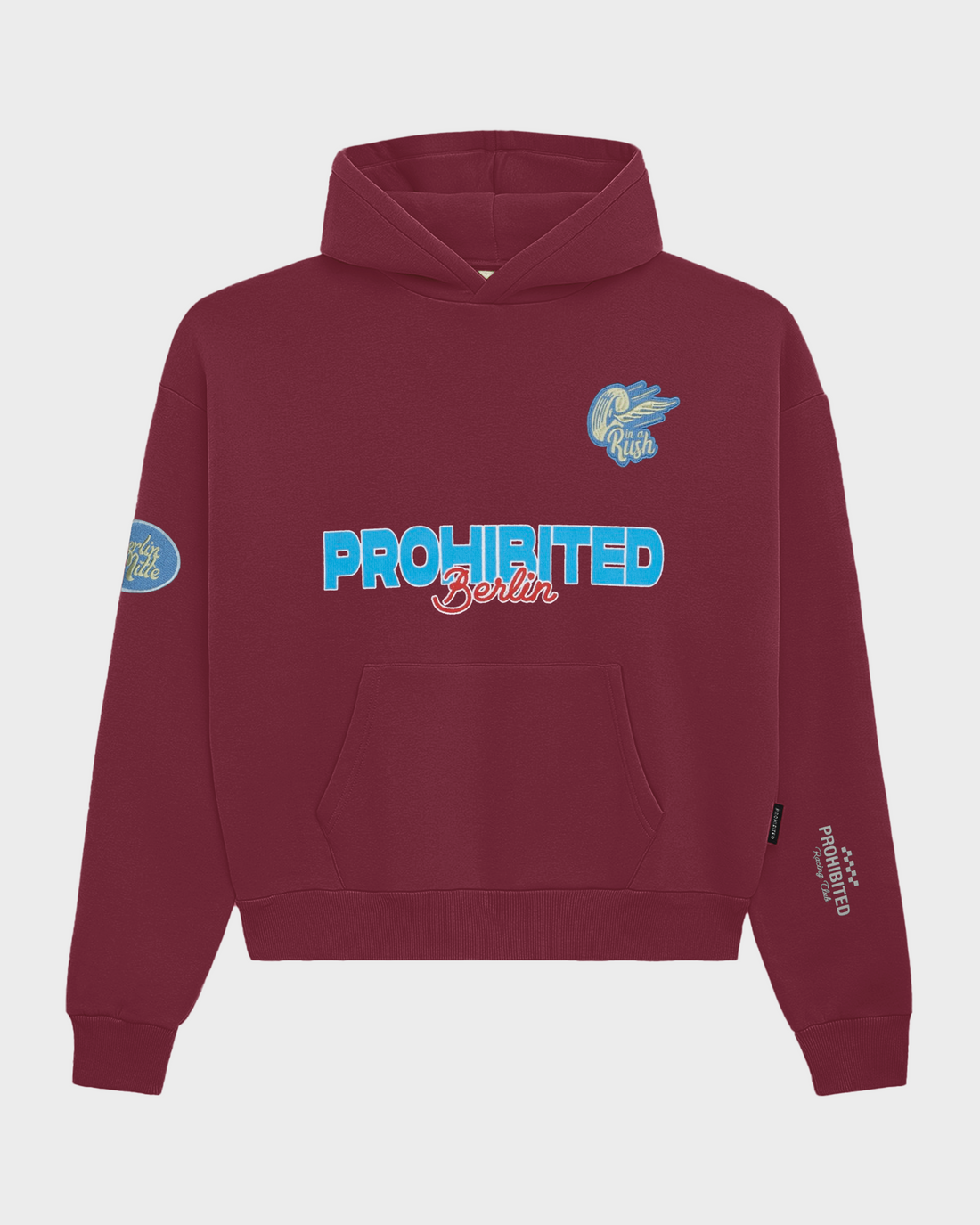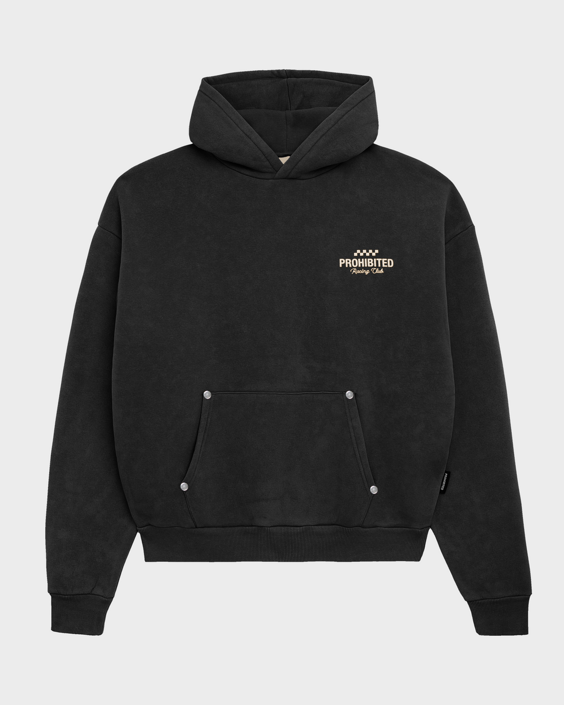 Oversized-fitStonewashed-StoffProhibited Racing Club-Stickerei auf der linken BrustseiteMetallnieten an der Kängurutasche65 % Baumwolle, 35 % Polyester